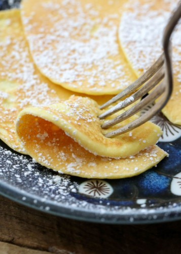 Put the eggs and cream cheese into the blender. If you want any additional flavors, add them now. Blend until smooth. (This takes just a few moments.) Let the batter rest a moment while the griddle heats. Butter the hot skillet or griddle and start by pouring just a 1/8 cup (or two tablespoons) of the mixture onto the hot surface. Remember that it will spread out a lot; these are very thin pancakes.