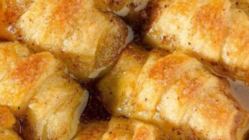 Melt butter in the bottom of cookie sheet pan or 9″x13″ casserole dish. Place biscuits on top of melted butter and bake for 12-15 minutes or until brown at 425 degrees Fahrenheit.