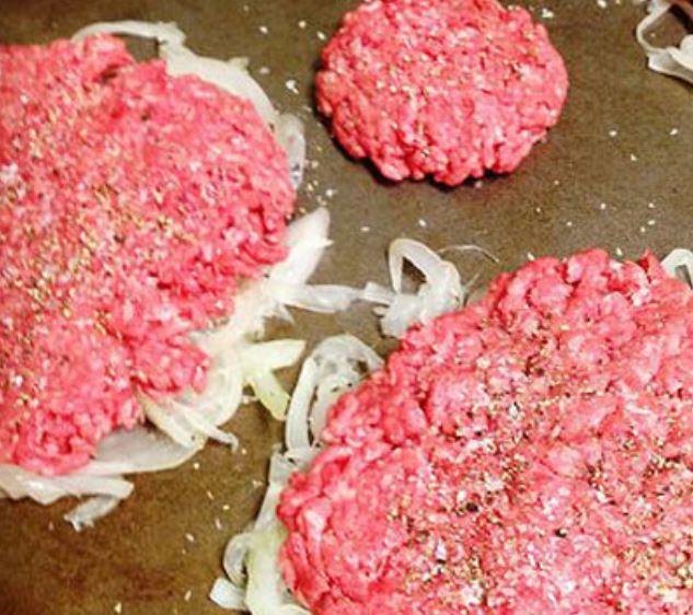 Divide the onions into 4 separate mounds on a rimmed baking sheet. Form the beef into 4 lightly packed balls. Place the beef balls on top of the onion mounds and flatten the beef firmly (use your palm) so the onion adheres to the beef. The patties should measure 4 inches in diameter. Season the beef generously with salt and pepper.