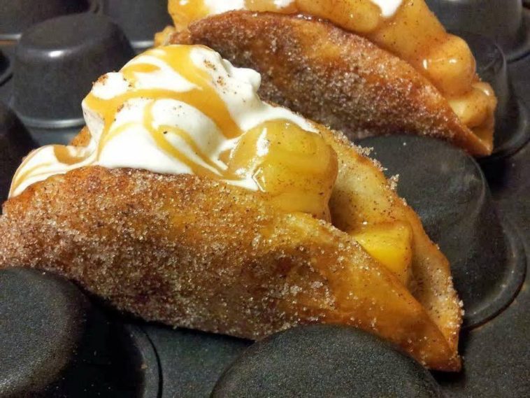 Then lay it on one side until browned and then place another side down until browned. Remove from oil and Sprinkle browned tortilla with sugar-cinnamon mixture. Fill taco shells with apple pie filling and top with whipped cream, and sprinkle a little more of the sugar-cinnamon mixture on top.