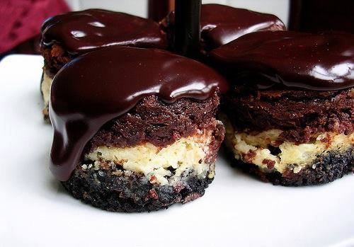 Pour or spoon batter into cheesecake pan cups to fill to a little less than half of the cup. Then add the melted chocolate to the rest of the batter. Fill the cups to about 3/4 full.