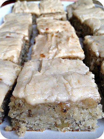 1. Heat oven to 375F. Grease and flour 15×10-inch jelly roll pan. For the bars, in a large bowl, beat together sugar, sour cream, butter, and eggs until creamy. Blend in bananas and vanilla extract. Add flour, baking soda, salt, and blend for 1 minute. Stir in walnuts.