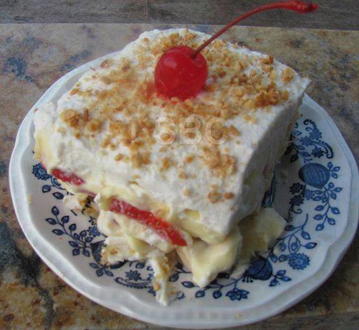 In another bowl mix together cold milk and vanilla pudding and set aside. In a large bowl, beat together whipping cream, vanilla and powdered sugar until soft peaks form. Remove 1 cup of whipped cream and mix into pudding. Layer pudding over bananas. Spread remaining whipped cream over pudding and sprinkle with nuts. Chill for 5 hours before serving. Don’t forget the cherry!