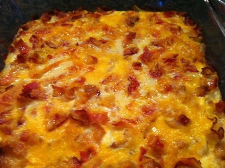 Start cooking the bacon and place the potatoes in a 9×13 baking dish then sprinkle the mixture of the cheeses over it.