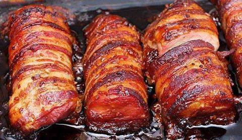 Wrap the tenderloin pieces in bacon. Place in an 8 1/2″ x 11″ pan. Poke holes in meat with a fork.