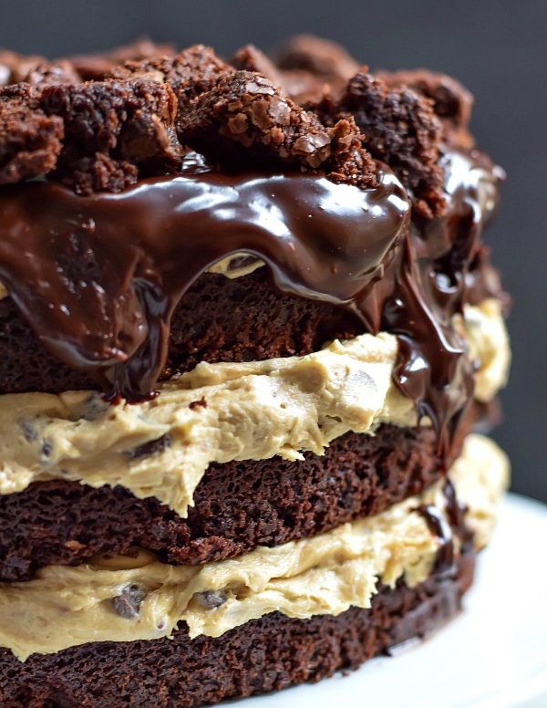 Anyways, I’m getting off track. Because I love him, and it was his birthday, after all, I came up with this amazing brownie chocolate chip cookie dough cake and I even added a layer of dark chocolate ganache on top because I’m just that nice. The cake itself was really easy to make. The brownie layers are just brownies baked in 9-inch round cake pans. I used a box mix but if you have a homemade brownie recipe you love you can certainly use that. The filling is no-bake cookie dough which is so delicious you’re going to have to stop yourself from eating half of it before it makes it on to the cake. I used my favorite chocolate chip cookie recipe and removed the eggs from it. I replaced the moisture from the eggs with a little bit of milk and I added just enough to make it a little looser than cookie dough would usually be so it spread more like a frosting.