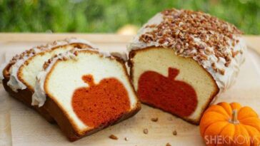 Peekaboo pumpkin pound cake with brown butter pecan icing