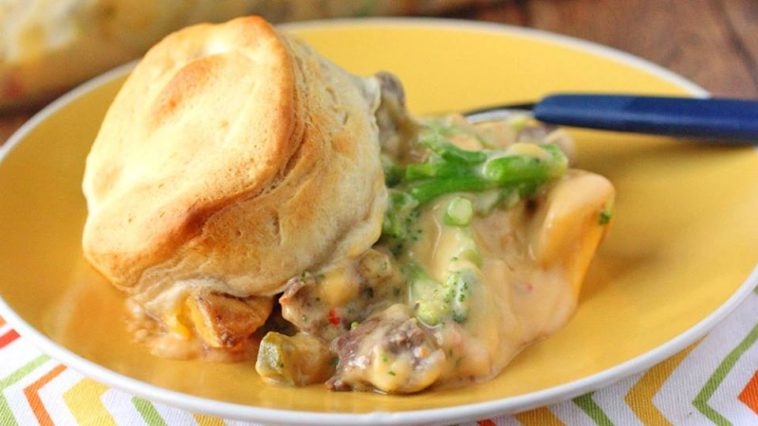 Heat oven to 375°F In 10-inch nonstick sauté pan or skillet, cook beef over medium heat 10 to 12 minutes or until browned and thoroughly cooked. Remove from heat; place beef in a large bowl. Add thawed potatoes and broccoli; toss until evenly distributed. Pour mixture into ungreased 13×9-inch (3-quart) glass baking dish; spread evenly. Pour cheese sauce evenly over beef and vegetables in the dish. Separate dough into 8 biscuits; arrange evenly over top. Bake 18 to 20 minutes or until biscuits are golden brown. Serve immediately.