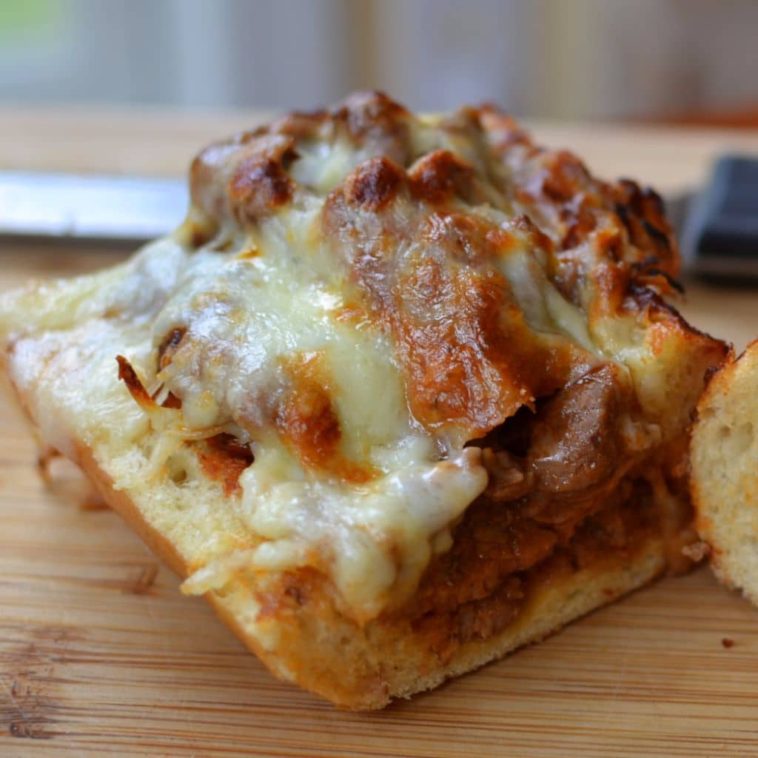 Spoon beef mixture into French bread boat. Top with cheese and bake at 350 degrees for 15 minutes or until cheese is melted. Turn the broiler on the last minute of cooking just to brown the cheese touch. Stay close by broilers are finicky.