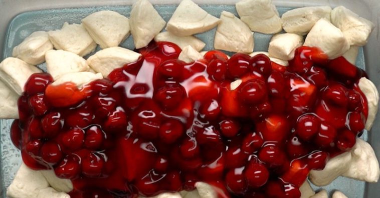 Open the biscuit can, separate the biscuits and cut each into four equal pieces. Place the biscuit pieces into the casserole dish.