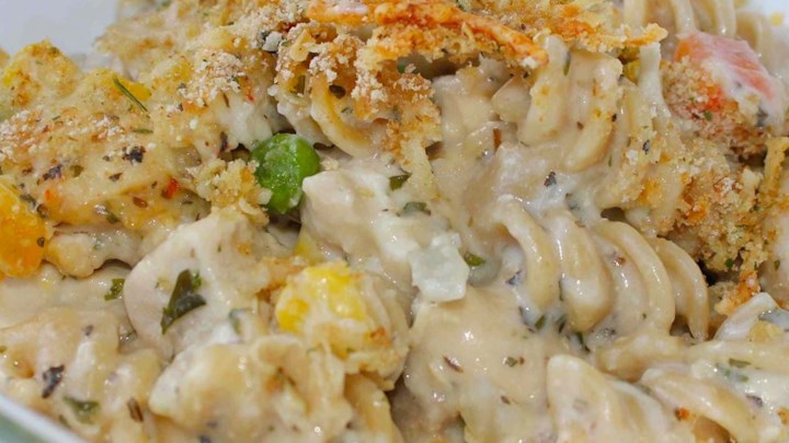 In a small bowl, mix the bread crumbs, Parmesan cheese, and butter. Spread evenly over the casserole.