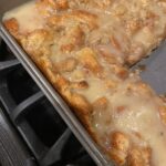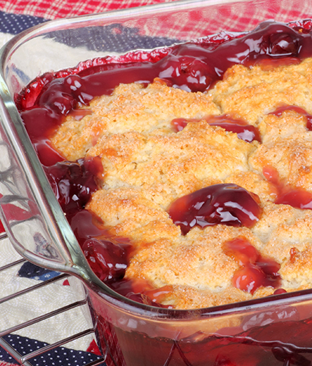 - Drop the combined milk and flour mix in approximately 9 large spoonfuls so that it is evenly distributed over the cherry mix in the baking dish.