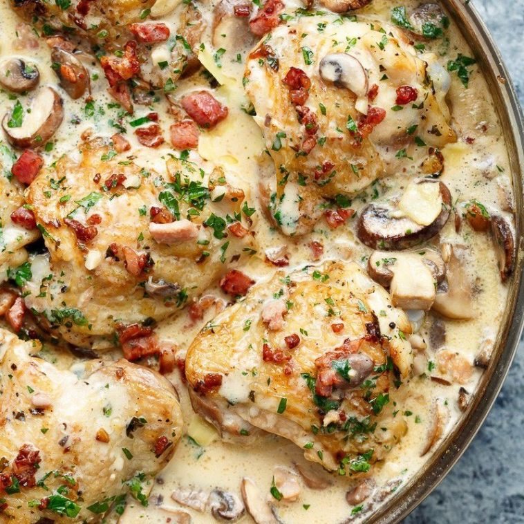 Creamy Garlic Parmesan Mushroom Chicken & Bacon is packed full of flavour for an easy, weeknight dinner the whole family will love!