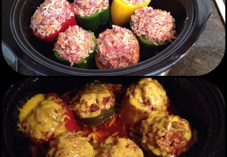 This is a forgiving recipe & is a great base for added or substitute ingredients, to taste. I did not make the recipe as stated but give this a 5 star with my many modifications [using what I had on hand] – My mods. include: adding 1/2 large zucchini/shredded; 3 green onions/finely chopped; 1/4c cilantro leaves/chopped; a splash of Worcestershire sauce; 2T minced jar garlic; 1/3c HOT taco sauce (instead of can tomatoes); finely minced strip steak instead of ground beef [pan cooked in oil before adding to pepper stuffing]; used low-fat mexi cheese blend and 1/4c couscous instead of rice. Stuffed ONLY red peppers. Topped stuffed peppers with some hot taco sauce, S&P, onion & garlic powder. Cooked on LOW in slow cooker 6 hrs. then topped with more shredded low-fat cheese last 10 minutes of cooking.