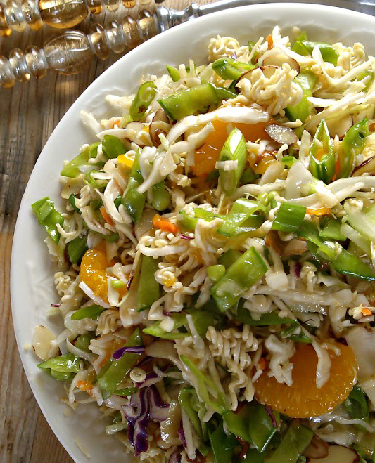 Combine coleslaw mix, snow peas (or edamame), scallions, mandarin oranges, and almonds in a large bowl; set aside.