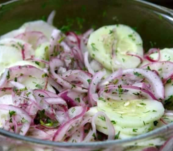 Place the sliced cucumbers, sliced onions, lime juice, chopped cilantro, and olive oil in a bowl.