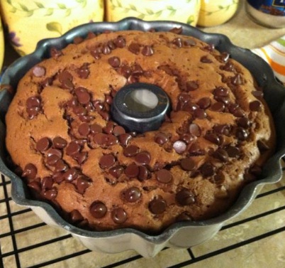 Pour half the batter in a bundt pan and top with half the chocolate chips.