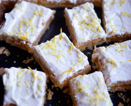 To make the topping, whip the cream until stiff peaks form, mix in the coconut and icing sugar, spread over the top of the lemon layer, and sprinkle lemon zest over the top.