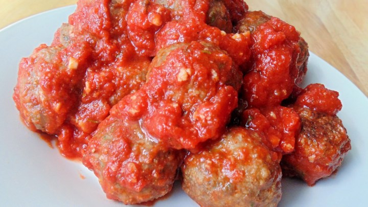 In a bowl, mix the ground beef, bread crumbs, parsley, garlic, onion, and egg. Shape the mixture into 16 meatballs.