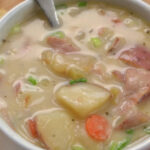 Bring to a low boil. Cover and reduce to simmer. Simmer for 1 1/2 -2 hours. Drain chicken broth, return bacon/onion mixture and heat for 1-2 minutes. Add butter, stir and serve.