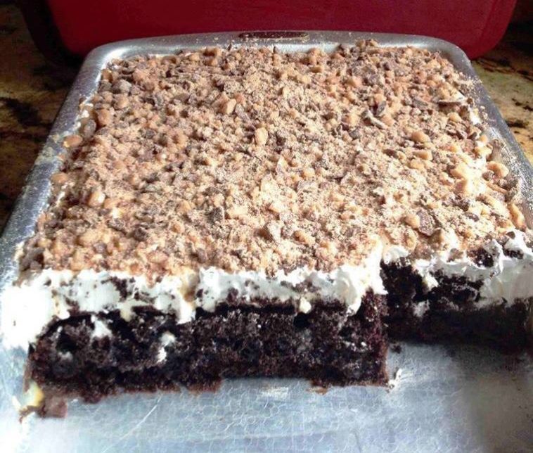 Prepare and cook cake as directed on the box in a 9×13 pan. Let cool. Take a drinking straw and poke holes close together all over the cake top. Slowly pour condensed milk over top of cake filling in the holes. Repeat this step using the caramel topping. Spread Cool Whip over the top and sprinkle toffee bits on top the Cool Whip. Chill several hours or overnight