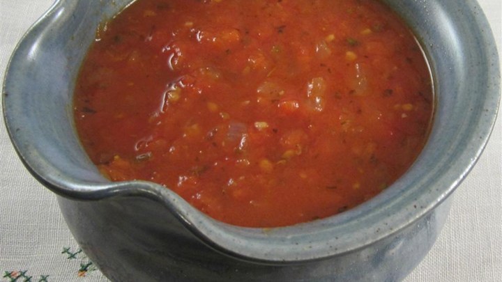 “A rich, flavorful sauce that is healthy. Great for use in pasta, lasagna, and other casseroles. My favorite way to eat it is to pour over raw zucchini ‘pasta’ for an extra-fresh and tasty meal that’s very healthy, too! A great recipe for using up extra-ripe tomatoes from your garden. Double the batch and freeze half; it freezes well.”