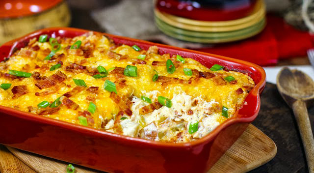 Sprinkle casserole with reserved bacon and scallions. Serve and enjoy!