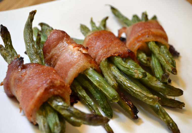 Divide beans evenly; wrapping in the middle of each piece of bacon to create four bundles.