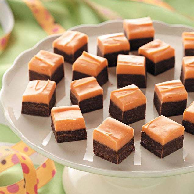 Meanwhile, in a microwave-safe bowl, melt candy coating with remaining milk; stir until smooth. Stir in extract and food coloring. Spread over chocolate layer. If desired, sprinkle with candy corn.
