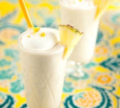 In a blender, combine the pineapple chunks, coconut milk, banana, ice and, if desired, honey. Puree until smooth. Pour into 2 large glasses. Garnish each serving with a pineapple wedge.