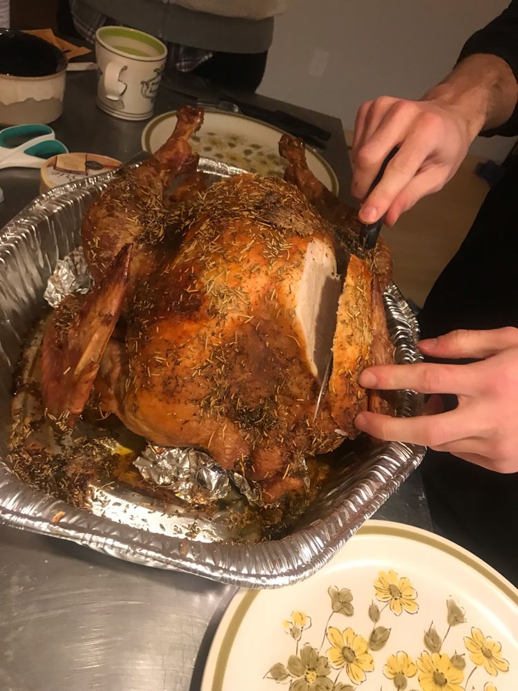 - Remove the turkey from the oven and let it rest briefly before carving.