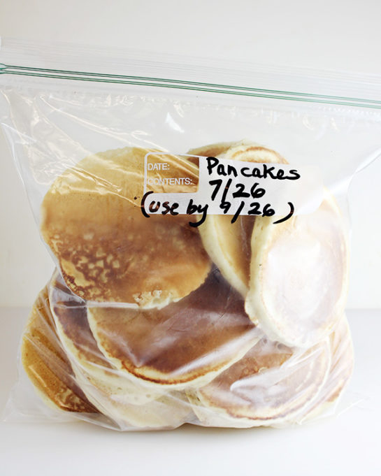Place cooked pancakes in a single layer on a baking sheet lined with parchment paper or Silpat liner. Put baking sheet in the freezer for 1 hour, until pancakes have frozen.