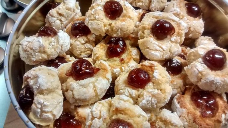 Whip the egg whites until fluffy, add the extract. Mix the almond meal, sugar and baking powder together. Gradually add to the egg whites and mix til a firmish dough. Roll tablespoon of the mix I to balls, and coat with the icing sugar. Place on baking sheet and press cherry half onto top of biscuit. Bake at 170° for about 12-15 minutes.