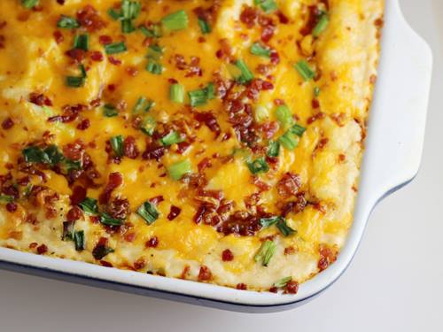 Spray a baking dish (approx 13×9″) with cooking spray. Preheat oven to 350 degrees F. Spoon loaded mashed potatoes into baking dish. Top with remaining Cheddar cheese. If desired, top with sliced green onions and bacon. Cover with foil and bake for about 15-20 minutes. Remove foil and continue baking until until cheese is melted and top begins to brown