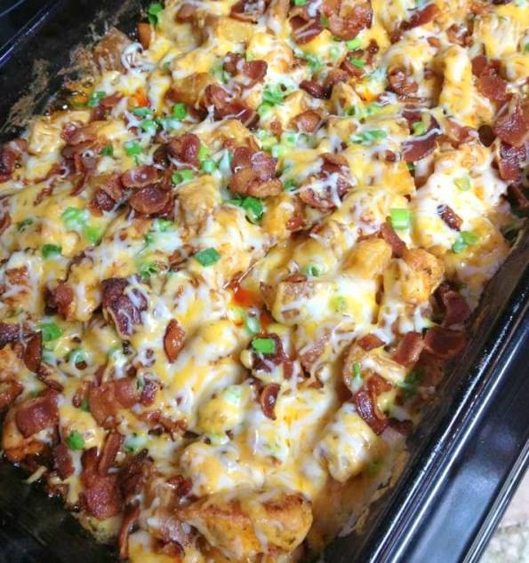 Add the cubed potatoes and chicken and stir to coat. Carefully scoop the potatoes and chicken into the prepared baking dish..