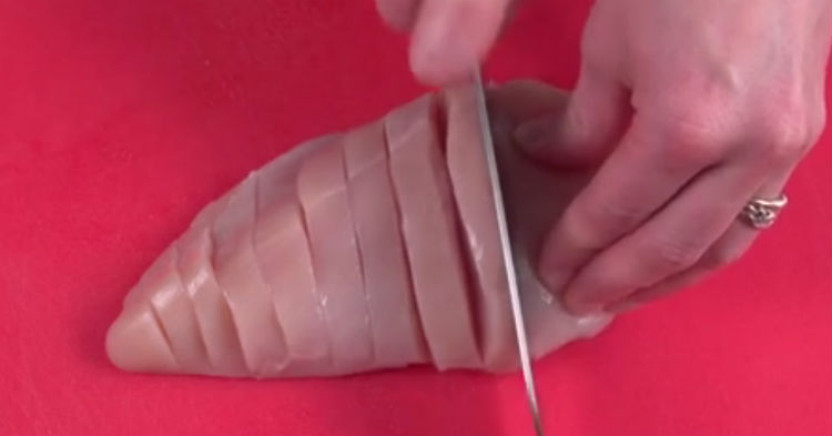 4. Cut slits into the chicken breasts, about 1 centimeter (0.39 inches) apart and 75% of the way through the chicken.