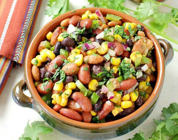 In a large bowl, combine all of the beans, green pepper, frozen corn, and red onion.