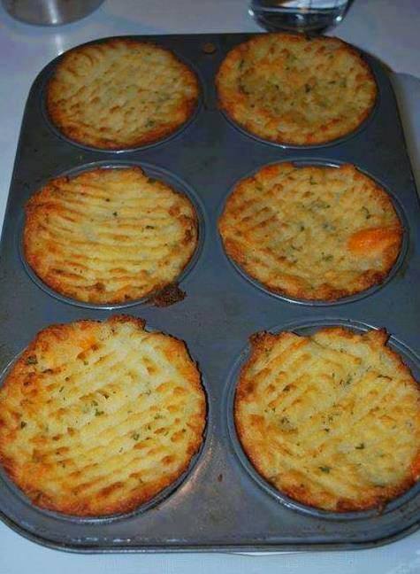 Just mash potatoes plain with butter or you can add yummy ingredients like cooked bacon, cheese, parsley, green onion, garlic, etc. Stuff in to a greased muffin tin, run a fork along the top and brush with melted butter or olive oil. Bake at 375 degrees or until tops are crispy and golden.