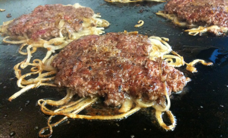 Melt the butter with the oil in a 12-inch skillet over medium heat. Using a large spatula, transfer the patties to the skillet, onion side down. Cook for 6-8 minutes, until the onions turn a deep golden brown and begin to crisp around the edges. Flip the burgers, then increase the heat to high and cook until well browned on the second side, about 2 minutes.