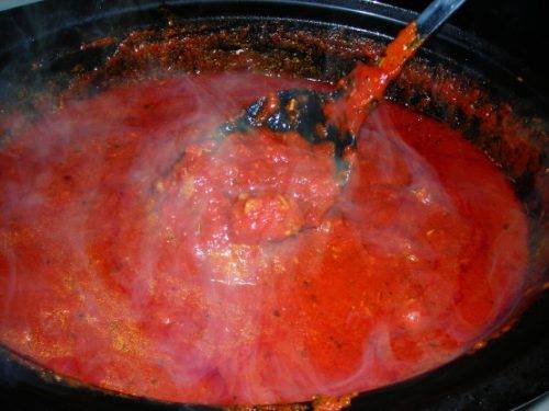In a large stockpot on low-med heat add your olive oil and saute your onions for about 4 minutes, then add your crushed garlic, cook for 2 minutes longer. Then add your water, and tomato products. Be sure to mix everything very well. Add in your spices and cheese. cook for 2 1/2 hours covered. Then add in your wine, and cook 30 minutes longer. The sauce will be thin on the first day. Also if you use meat it will alter thickness. The second day this turns into a nice thick sauce.