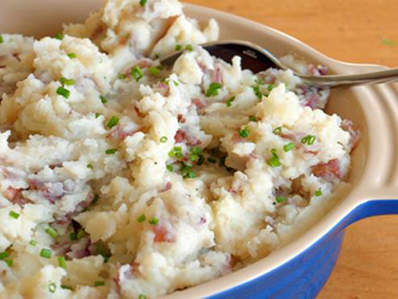 Use a slotted spoon or hand-held strainer to transfer cooked potatoes to a shallow bowl or serving dish. Reserve hot cooking water. Top potatoes with butter, Parmigiano Reggiano, salt and pepper. Use a fork to smash the potatoes, adding cooking liquid as necessary to make potatoes as creamy as you like (I usually add about a ½ cup total). Taste and adjust seasoning if necessary. Sprinkle fresh chives over top and serve.