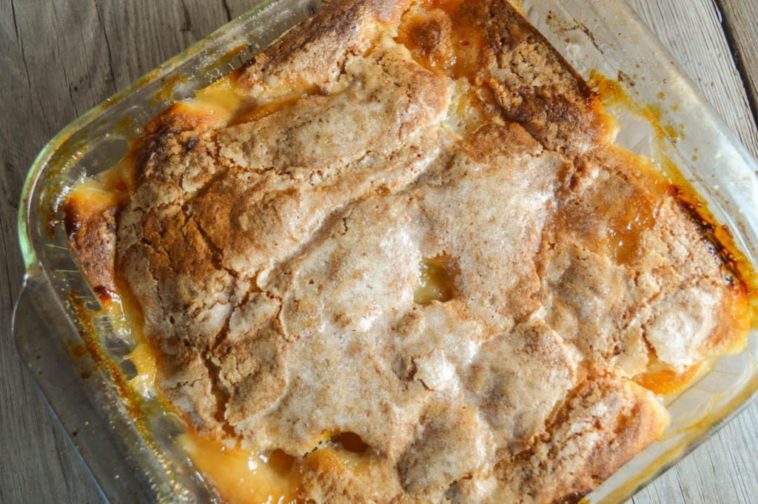 Grease a deep 8 x 8-inch baking dish and line bottom with peaches.