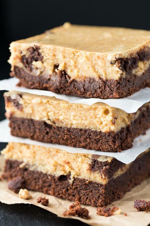 Pour peanut butter mixture on top of chocolate mixture in the prepared pan.