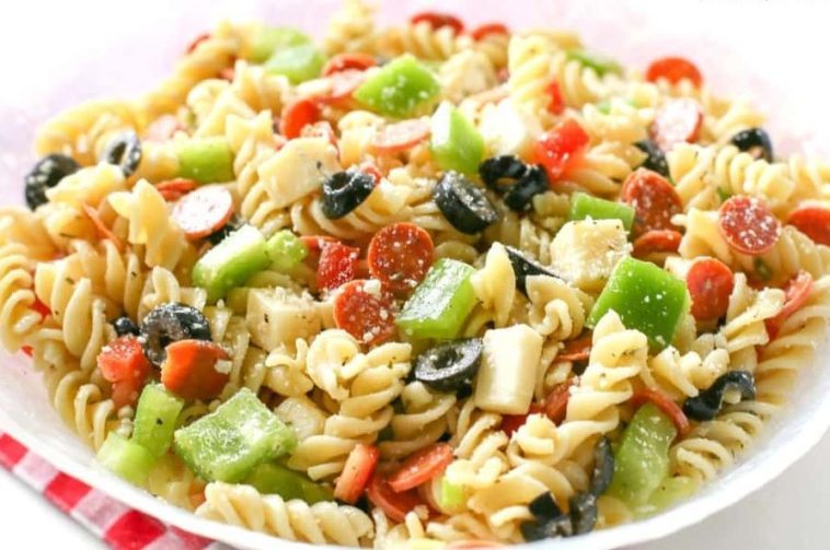 Place cooked pasta, vinegar mixture, and remaining ingredients in a large mixing bowl, turning to coat all ingredients. Refrigerate at least 2 hours before serving.