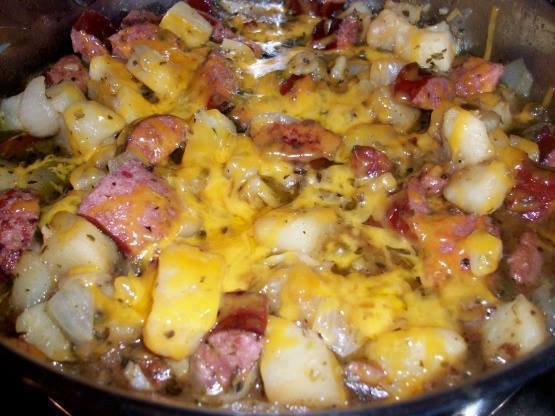 In dutch oven, brown potatoes, kielbasa, onion and peppers in oil.