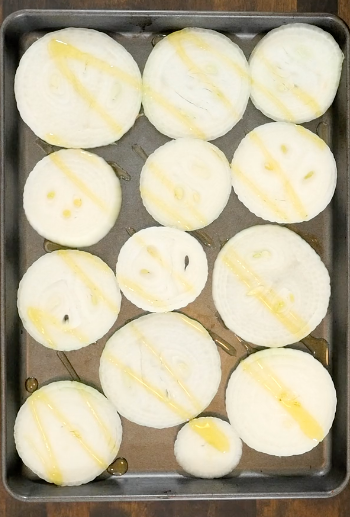- Spread onion rings out in a 9×13-inch baking dish, keeping rings and layers intact, then drizzle with olive oil and season generously with salt and pepper.