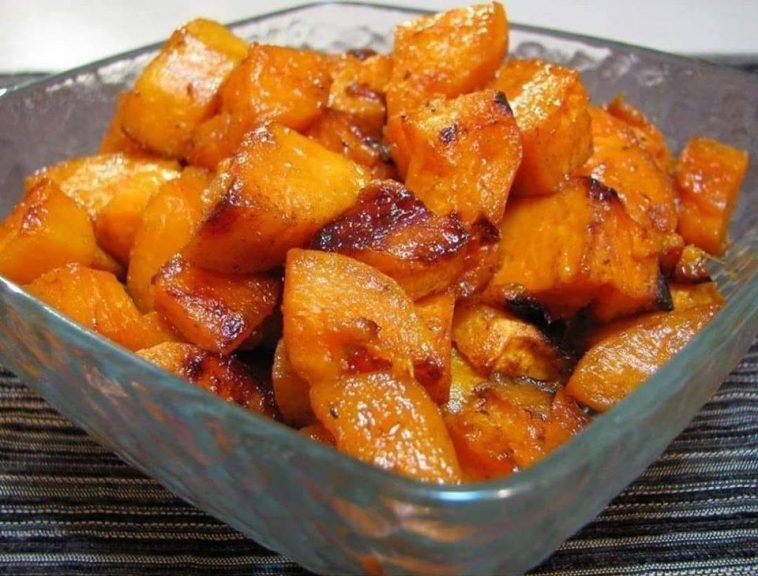 Melt butter in the microwave and pour over the potatoes along with the olive oil, brown sugar, cinnamon, nutmeg, ginger, and salt.