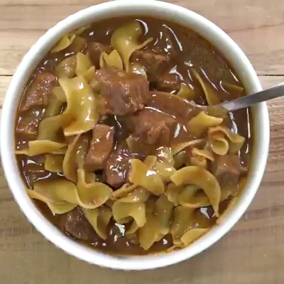 This pasta steak soup only requires a few ingredients. We usually do it with beef but you can use other meats, it’s very good with venison too… Start by browning the meat for a few minutes and then drop everything in the slow cooker. Few minutes before serving you’ll add your noodles.