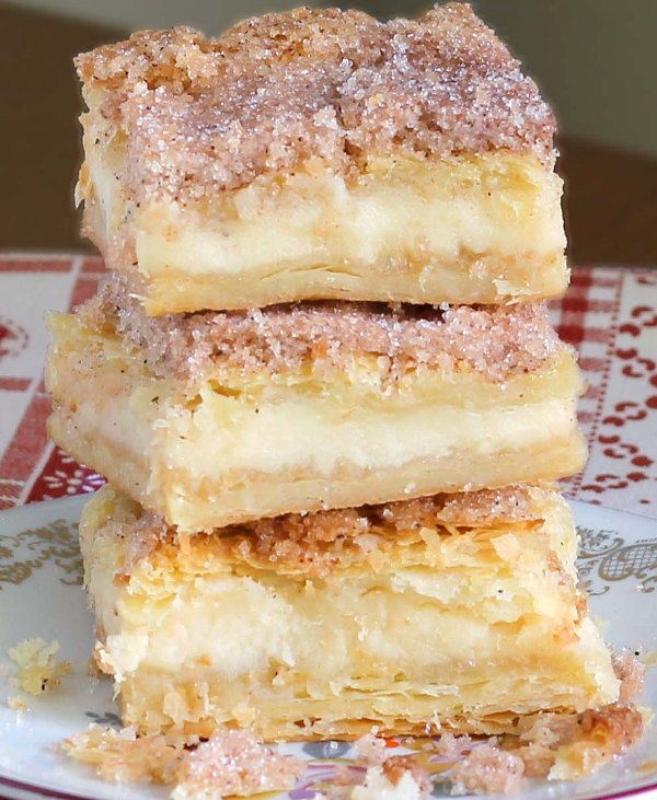 Using a teaspoon, evenly dot the cinnamon-sugar butter mixture over the top layer of crescent dough.