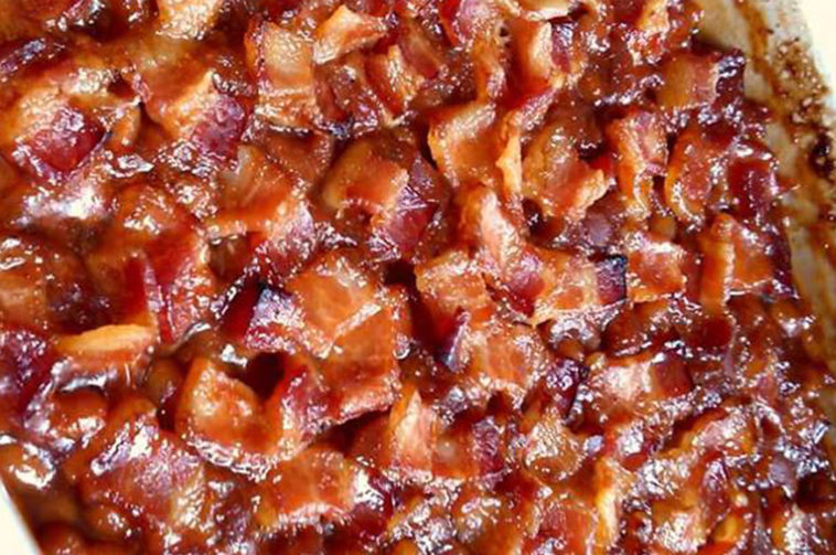 Cut bacon into 1/2 inch pieces then place pieces evenly in a single layer on top of beans. I like to kinda crumple each piece a bit instead of laying them flat – like little inchworms. The cute ride-on toys from the 80’s not actual worms because that’s gross. Bake beans, uncovered, at 350 degrees for 1 to 1.5 hours or until bacon is cooked through and starting to crisp. Enjoy!